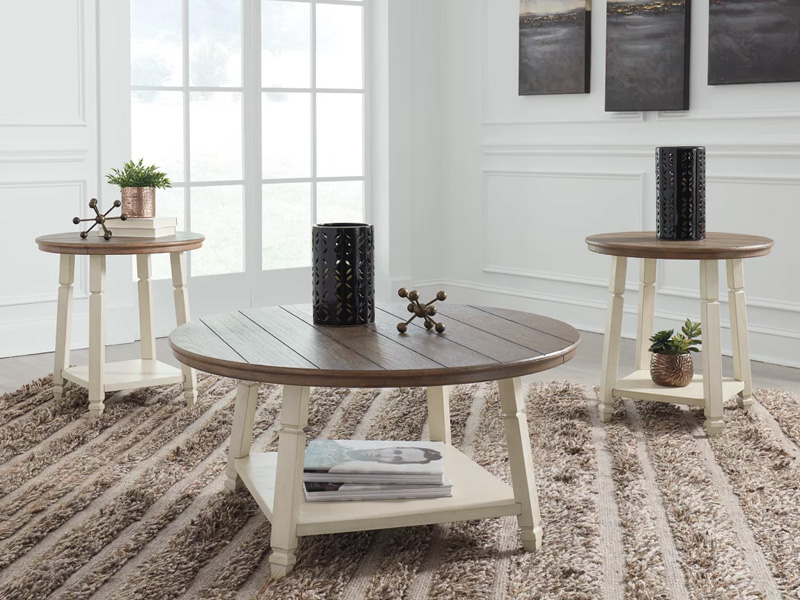 Round up country chic style for your living room repertoire with this occasional table set. Its round coffee table and two round end tables are in a popular two-tone finish that works great with the set's casual farmhouse design. Antique white bathes the lower shelves and turned legs, while a weathered oak color covers a planked-look top. The lower shelves can be used for displaying accents or open storage—what a brilliant touch.