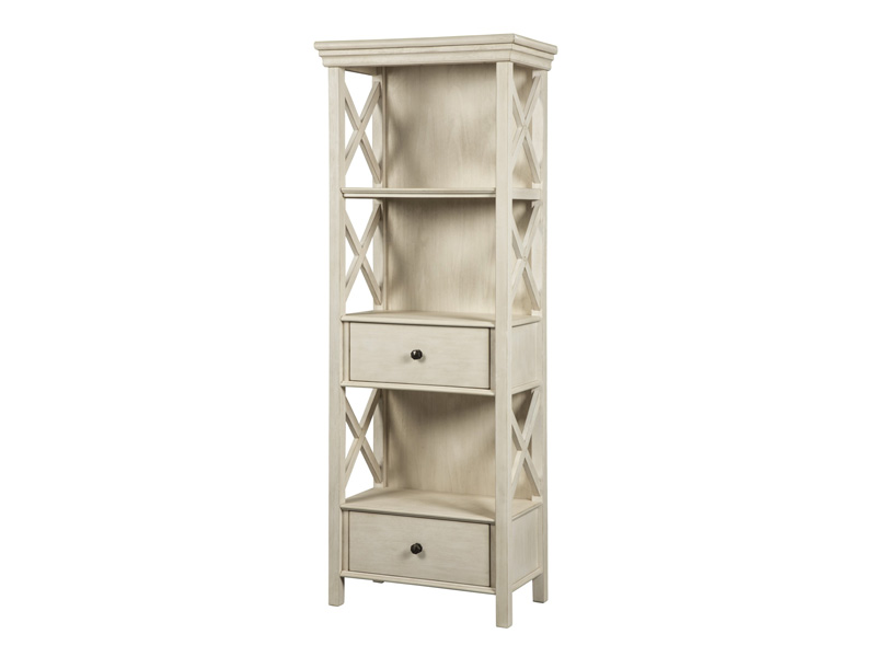 Need a stylish space to showcase dinnerware, pictures, decorations and more? This tall three-shelf display cabinet is a dream come true. The textured antiqued white finish provides a perfect backdrop for presentation. For the items you want to hide, there are two deep drawers. Embellished with the casual appeal of lattice sides, attractive crown moulding, clean lines and lightly distressed finish, this cottage-style shelf provides ample storage in such an artful way.