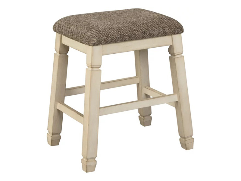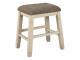 The beauty of this upholstered bar stool is something to savor. Designed to serve up comfort and flair, this backless bar stool entices with a saddle seat covered in a heavy woven fabric that complements the antiqued white finish.