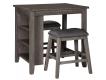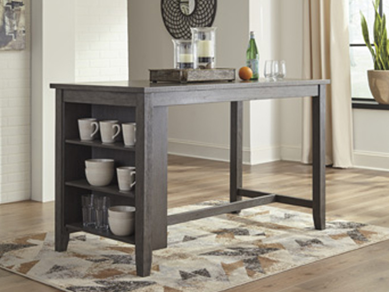 Perfect portion. Striking a simply chic pose, this dining room counter table serves up high style on a smaller scale. Its antiqued gray wash finish gives the clean-lined design a casually cool sensibility. Side shelves cleverly balance form and function.