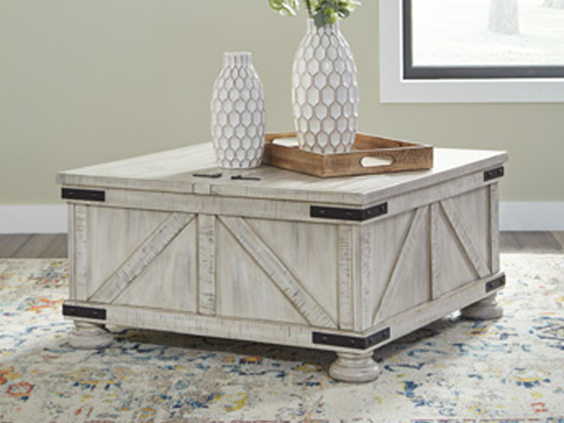 Double up on form and function with this square coffee table with storage. Its dual-lid tabletop provides easy access to the roomy storage space. Crafted with a distressed whitewash finish, crossbuck detailing and metal bracket appliques, this generously scaled coffee table is rustic farmhouse living at its best.