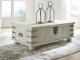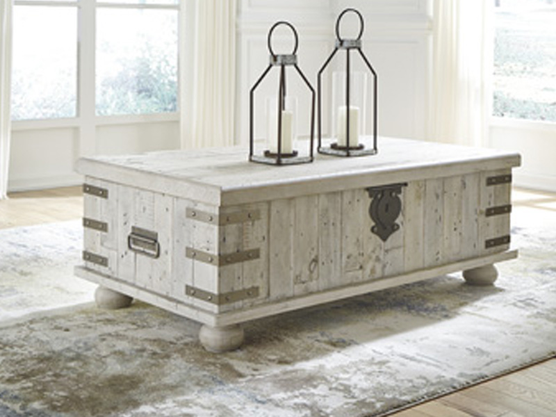 Unlock a quaint touch of farmhouse style and convenience in your living area with this lift top coffee table. Its design is inspired by the rugged looks of an antique storage trunk. Metal keyhole and bracket accents with rivets, a planked effect and large recessed bun feet dress up this charming piece. The distressed light gray finish enhances the wood's natural grain, which delivers a naturally aged feel. You’ll love its generous scale, offering a roomy top that's ideal for displaying accents and more. Lift the top and enjoy the accommodating work or dining surface. Under the lift top, there's a fully finished storage area—deeply spacious for organization.