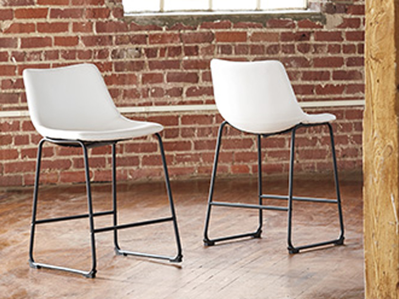 With its distinctive contoured bucket seat and tubular metal base, this bar stool serves up a fresh twist on mid-century inspired style. Contrasting white faux leather upholstery adds to the aesthetic. What a timeless look for eat-in kitchens and casually cool dining rooms.