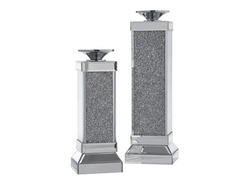 Add a touch of glamour to your accent table or mantle with this candle holder set. The cut-glass mirror base embellished with silvertone beaded accents will keep the candlelight dancing for hours.