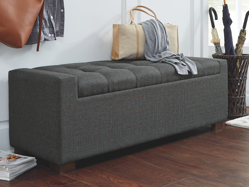 Whether gracing a front entry or living room, or placed at the foot of the bed, this upholstered storage bench is loaded with flair. Tufted cushioned seat with hinge reveals an ample storage compartment for this, that and the other. Gorgeous gray fabric is the epitome of neutral sophistication.