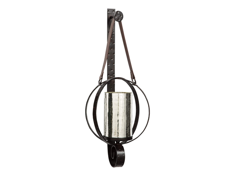 Love a rustically refined sense of style? You’re sure to be hooked on this one-of-a-kind wall sconce. Luminous mercury glass hurricane is encircled by hammered metal rings and secured by a strapping leather strap and metal wall brace.