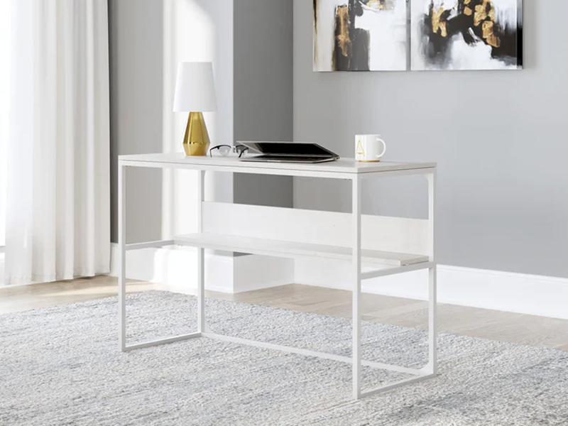 Bring your vision of a modern home workspace to life with this sleekly designed home office desk. Its linear construction and white finish keep things minimal. A small shelf along the back rounds out the versatile, striking desk.