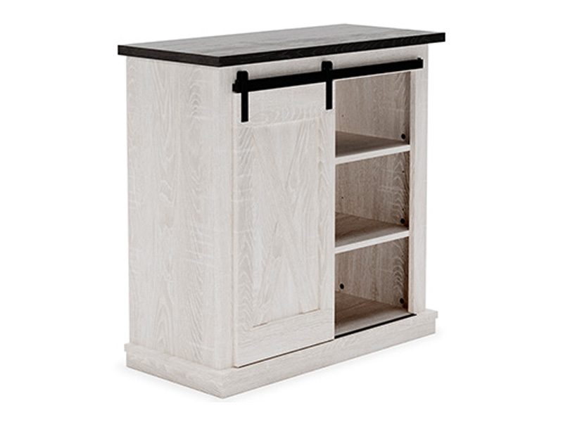 Raise the bar on modern farmhouse design with this accent cabinet. Sporting a two-tone, gray and antiqued white color scheme and a crossbuck door front, this cabinet's sliding "barn door" moves to reveal shelved storage space. What a charming complement to your casual-chic decor.