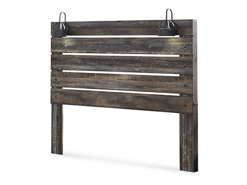 When merged in just the right way, rustic and industrial styles can make one happy marriage. Case in point: this king panel headboard. A refined take on barn board beauty, its complex, replicated wood grain showcases hints of burnt orange and teal tones for a sense of weatherworn authenticity. Love to read in bed? You’re sure to find the pair of retro-chic light sconces and USB plug-ins on the open-slat style headboard such a bright idea.