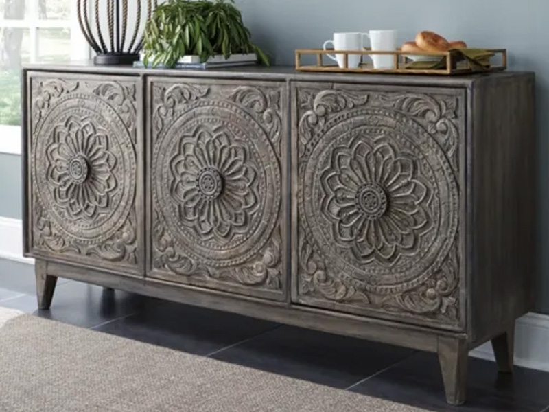 Have a taste for something exotic? Feast your eyes on this exquisitely styled console. Whether tantalizing in the dining room, gracing an entryway or serving as an eclectic TV stand—what a masterpiece of an accent piece. Fancifully floral-carved doors are a striking contrast to the console’s ultra-linear profile.