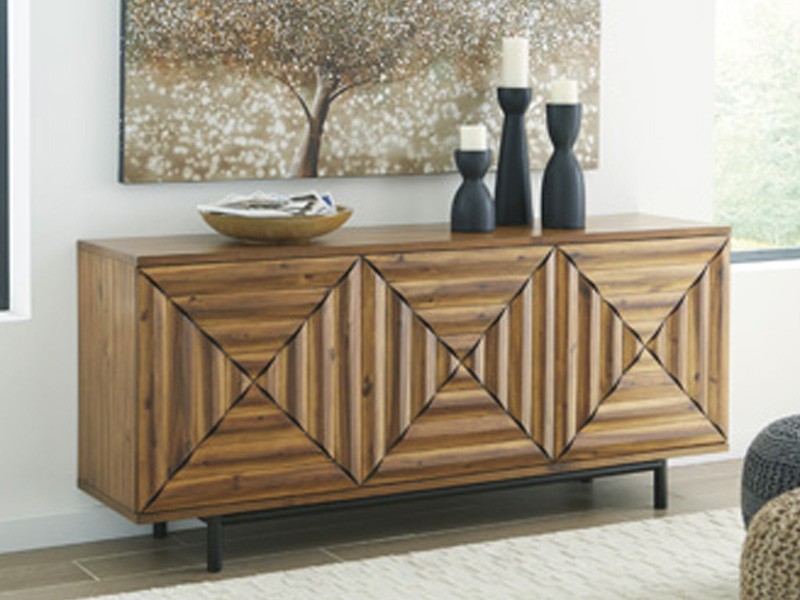 Whether you see squares, triangles or diamonds, you can’t help but be captivated by the high-end look and feel of this 3-door accent cabinet. Distinctive elements include inlay pattern touch latch doors made all the more interesting with cross-cut styling. Well equipped with adjustable shelving, this accent cabinet serves your storage needs beautifully.