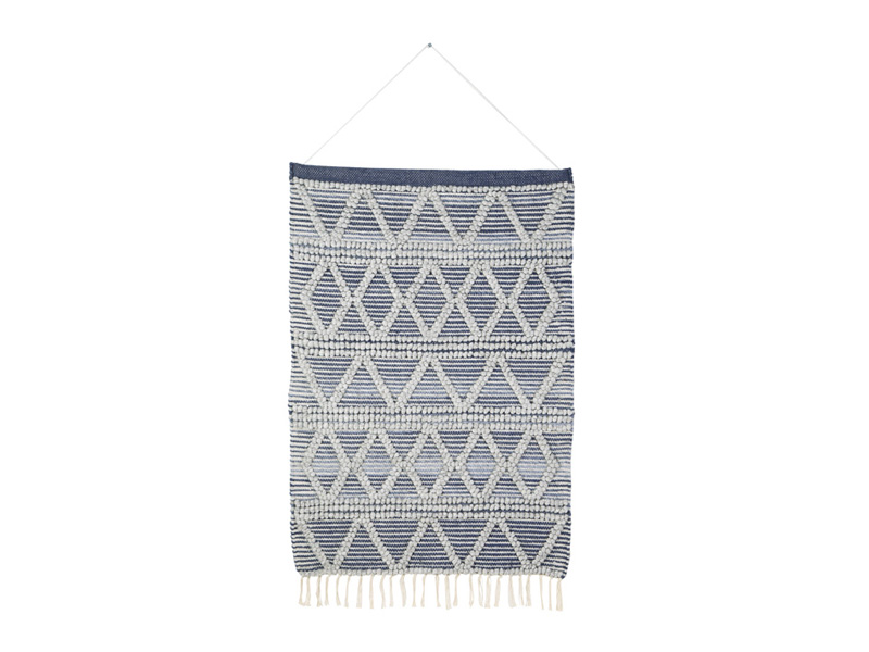 With boho-chic design in mind, this woven wall hanging adds eye-catching texture to your living space. Its diamond design, decorative fringe trim and shades of blue and gray will add interest to your wallscape, inside or out.
