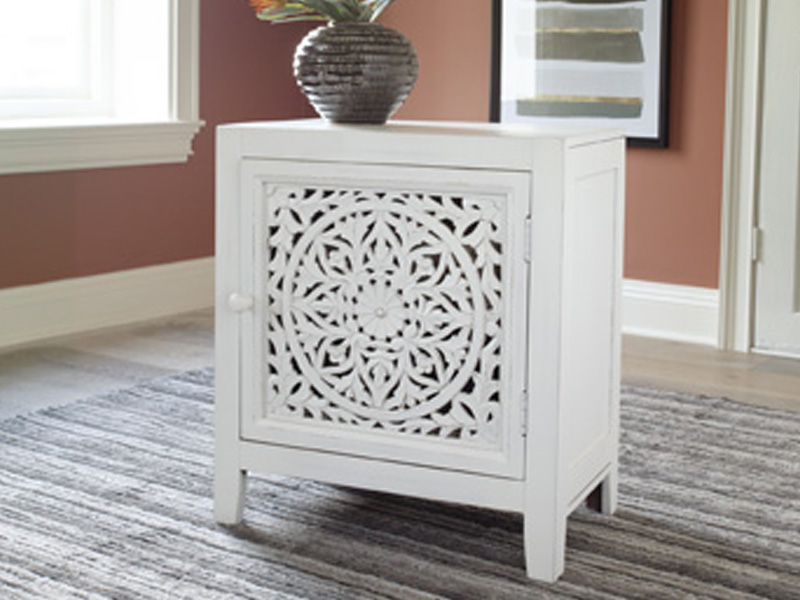 How could you not stare at a masterpiece? The floral carving on this accent cabinet is simply magnificent. This beauty is also functional. Pull the door open to reveal storage space with a handy shelf. With its antiqued white finish, this piece is a definite showstopper.
