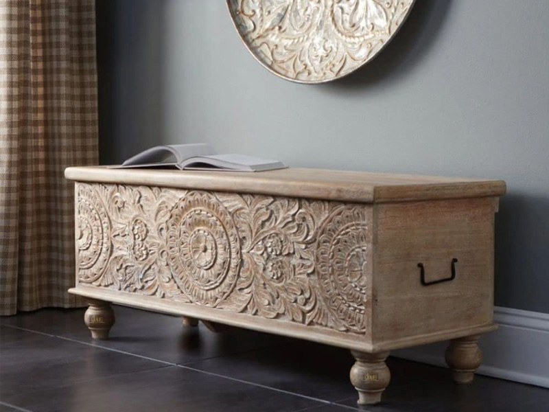 Merging practical storage with an exotic sense of flair, this storage bench stands out from the crowd in an intriguing way. Its grainy wood is beautified with an antique white finish, and the ornamental medallion carvings are pure artistry.