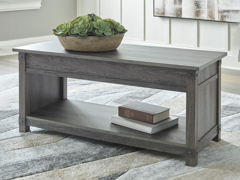 Raise the bar on modern farmhouse design with this lift top coffee table. Sporting a grayish brown replicated wood grain effect, its handy spring-loaded mechanism brings the tabletop closer to you. This versatile table makes it easier than ever to eat, work or play from the comfort of your sofa.