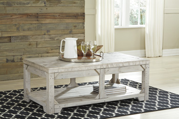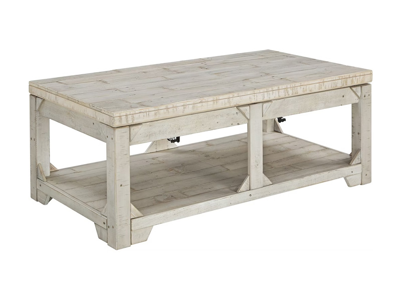 Take in the country fresh look of this lift top coffee table and reminisce of a simpler time. Its farmhouse style is evident in its stocky design with planked top/bottom shelf, unique triangle accents and relaxed white washed finish. With a handcrafted look, you'll love the casual feel this piece brings to your living area. Plus, easy lift top feature accommodates eating or working in front of the television.