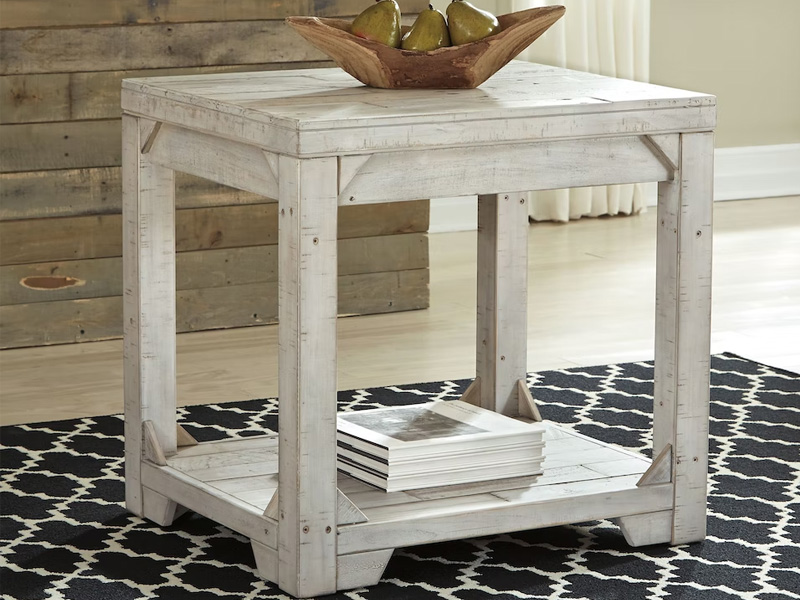 Take in the country fresh look of this end table and connect with a simpler time. Its farmhouse style is evident in its stocky design with planked top/bottom shelf, unique triangle accents and relaxed white washed finish. With a handcrafted look, you'll love the casual feel this piece brings to your living area.