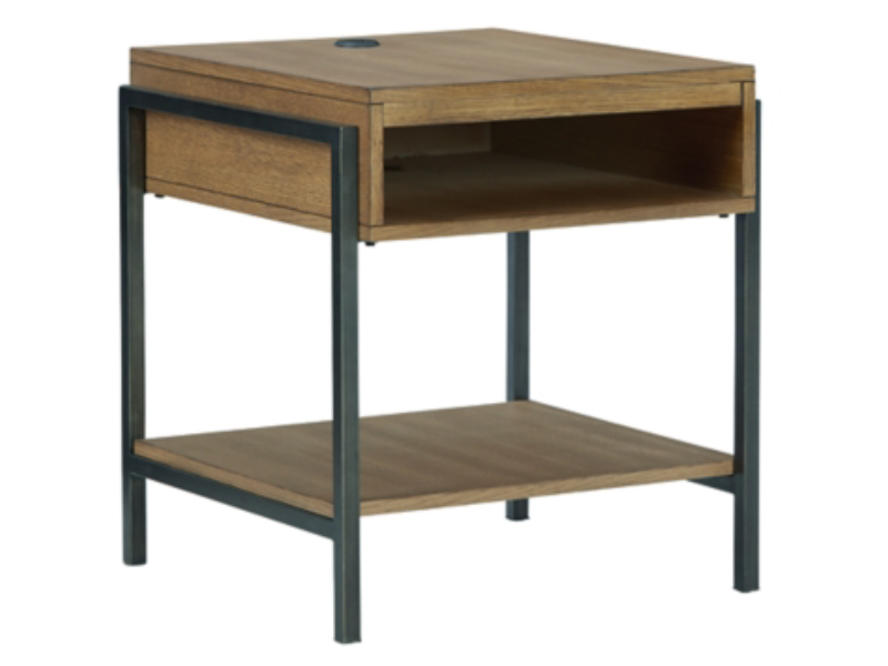 Beautiful to behold, this urban contemporary end table is loaded with high style and convenience. The wood sports a light, natural-looking finish that provides a dramatic contrast to the black metal frame. Its open cubby is perfect for stowing away books and magazines. A cleverly placed AC/USB charging port on the top lets you power up without moving a muscle.