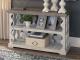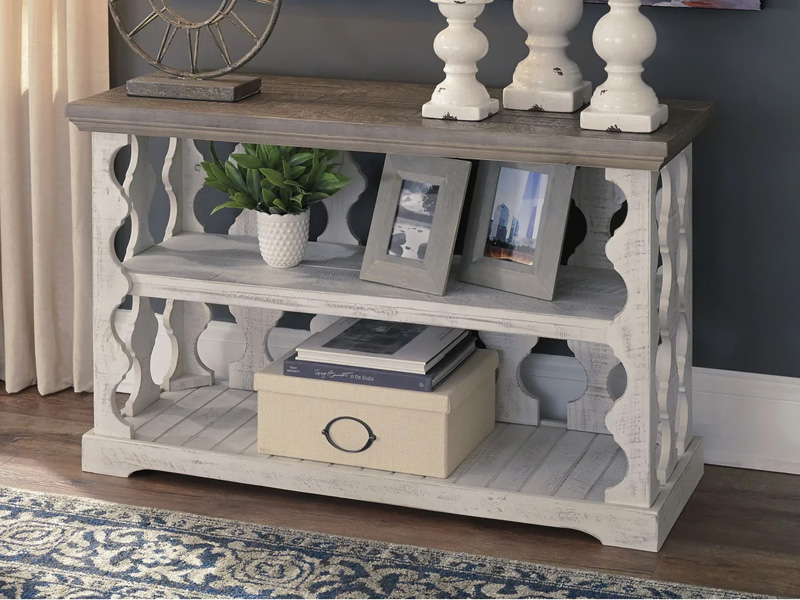 With its richly rustic finish and textural mix, this sofa table goes to town on bygone beauty. Its distressed two-tone treatment blends a weathered gray with vintage white for an utterly charming effect. Balustrade-style planks supporting the top create an eye-catching look that’s anything but ordinary.