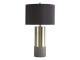 Faux concrete sets the stage for this ultra contemporary brass-tone table lamp. This substantial lamp is topped with a chic all-black shade with a goldtone foil interior for an elegant aesthetic.