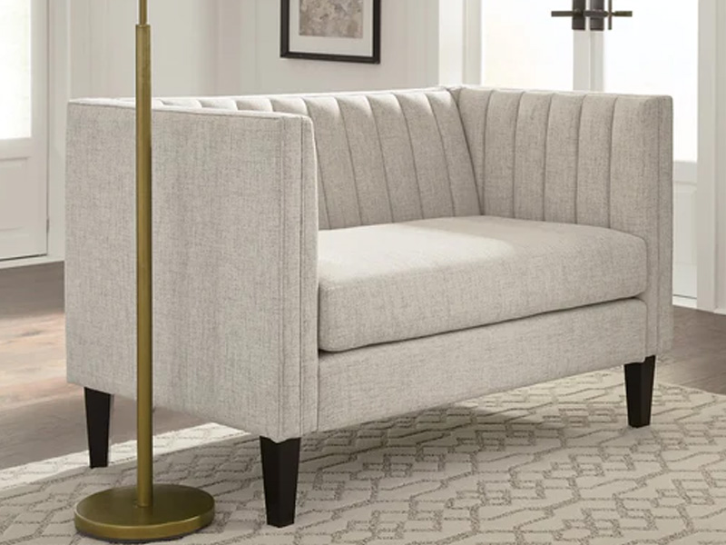 This settee boasts couture-inspired detailing with modern allure. Channel tufted arms and back design with wood tapered legs in dark brown elevate its luxe appeal with feel-good beige colored polyester fabric putting comfort in style.