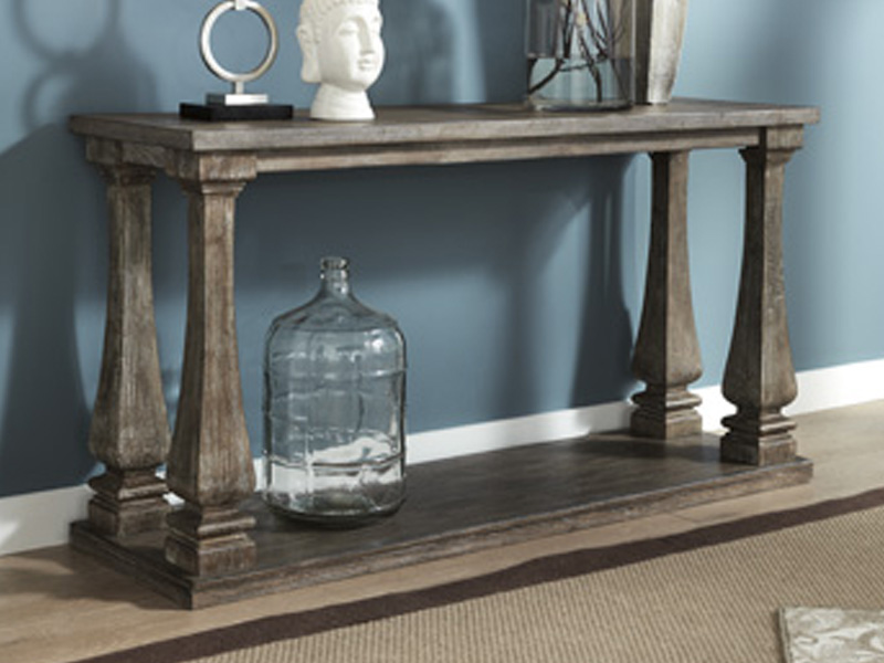 Homey. Hearty. Heavenly hued. Luring with a distressed weathered gray finish and square baluster legs set on a broad lower shelf for great presence, this sofa table is sure to make your homestead feel that much more like home. The look is beautified with elm veneers and a framed and plank-effect tabletop for a richly crafted masterpiece made for years of satisfaction.