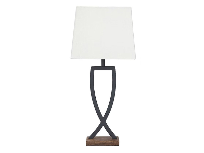 This table lamp is an enticing merge of mixed materials. Textured black finished metal stands poised atop a block of warm brown wood. Open design is right at home among casual decor.
