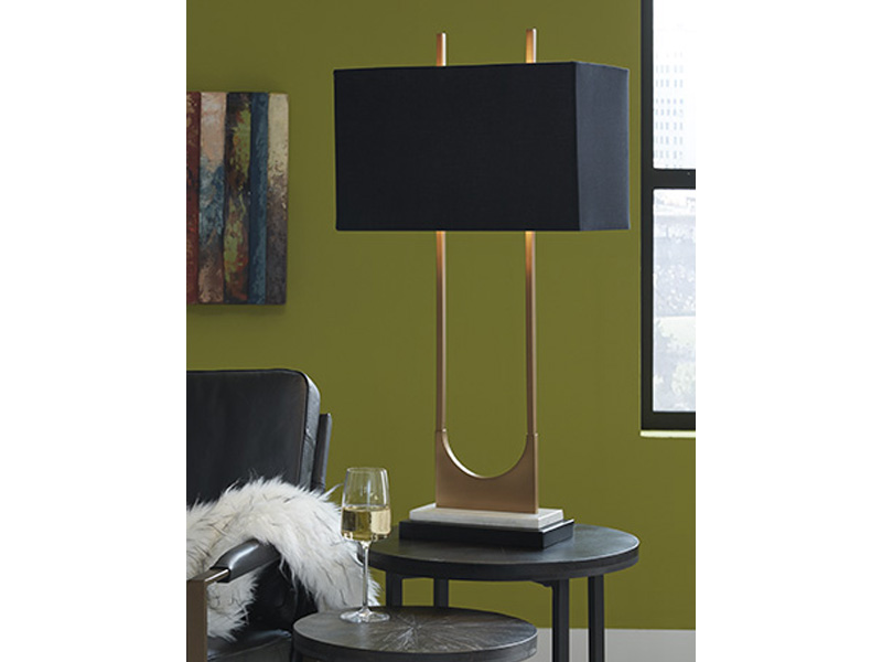 - Metal and marble with black fabric hardback shade