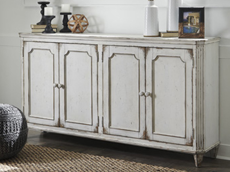 With its distressed vintage paint finish, fluted details and French provincial mouldings, this exquisite cabinet is sure to grace your space in such a très chic way. Adjustable shelved storage is abundantly practical, be it in a dining room, living room or entryway.