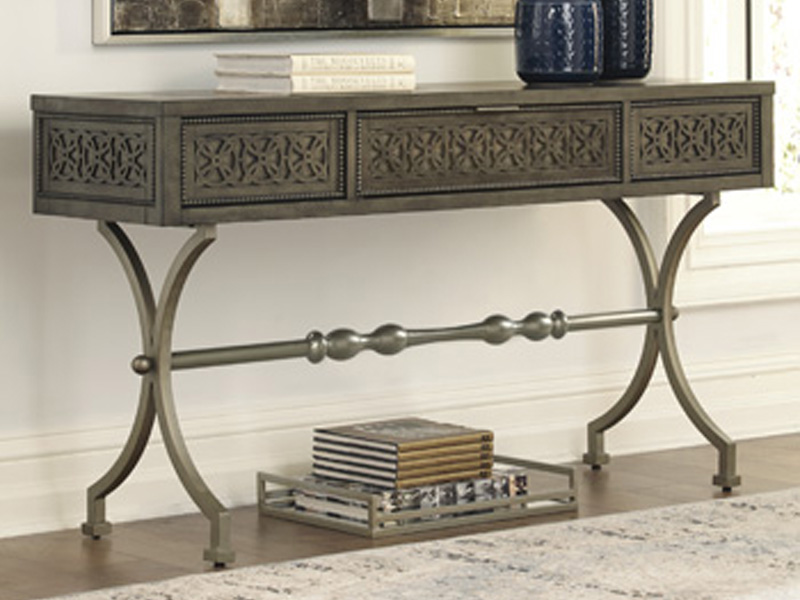 This console sofa table is style with a purpose. This casual look flaunts a medallion pattern along the front. Champagne color finished metal complements the antiqued gray finished wood. Show off decor on top. Rest assured X-base is as strong as it looks. Functional drawer allows you to keep knickknacks out of sight.