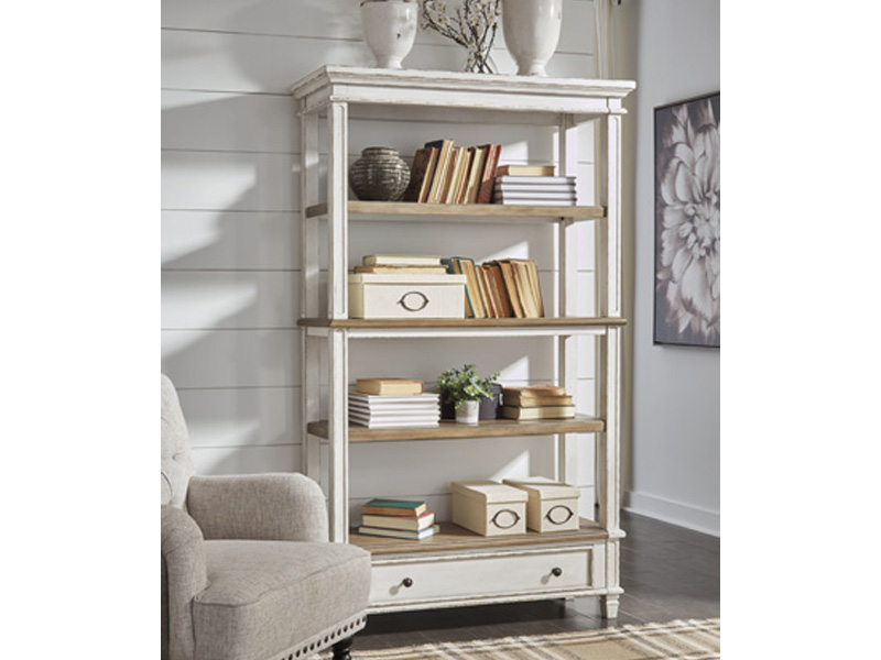 Elevating the art of traditional cottage styling, this bookcase is your heavenly home office realized. Antiqued two-tone aesthetic blends a chipped white with a distressed wood tone top for added charm. Clever balance of shelf and drawer space beautifully works.