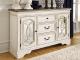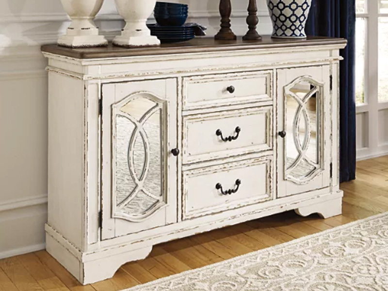 Serve up a French country-inspired feast for the eyes with this dining room server. Unique elements include cabinet storage beautified with decorative fretwork over mirrored glass and a doubly charming two-tone aesthetic pairing a chipped white with a distressed wood finished top.