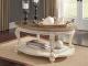 Elevating the art of traditional cottage styling, this oval coffee table is sure to serve you beautifully for years to come. Antiqued two-tone aesthetic blends a chipped white with a distressed wood finished top for added charm. Classic cabriole legs and shapely lower shelf are a lovely twist. Decorative corbels add refinement.