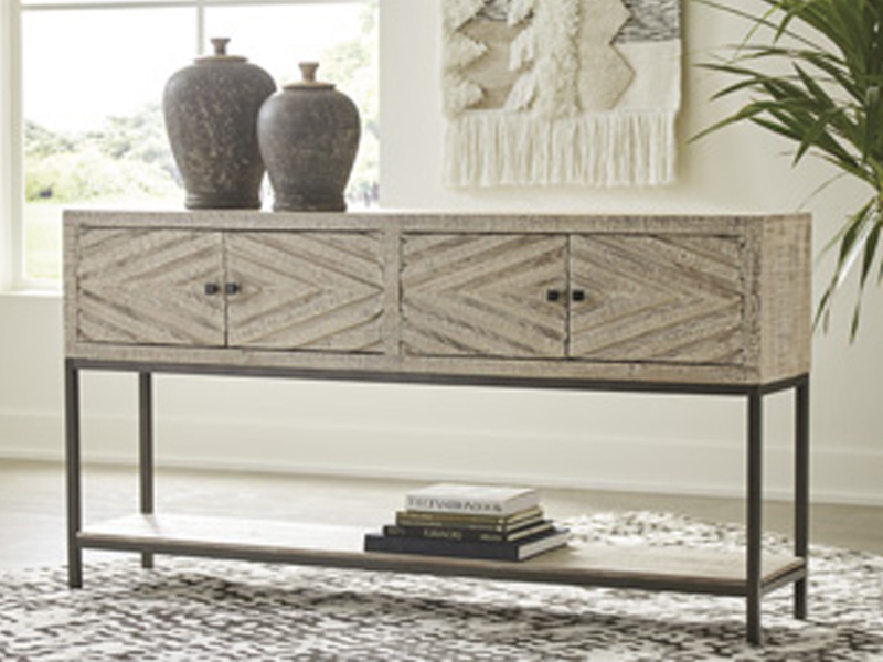 Make a cool, contemporary statement with this console sofa table. Sporting diamond-carved cabinet door fronts with great dimension, this designer piece is an inspired choice for an entryway, dining room or living space. Combination of distressed white wood and black metal is so striking.