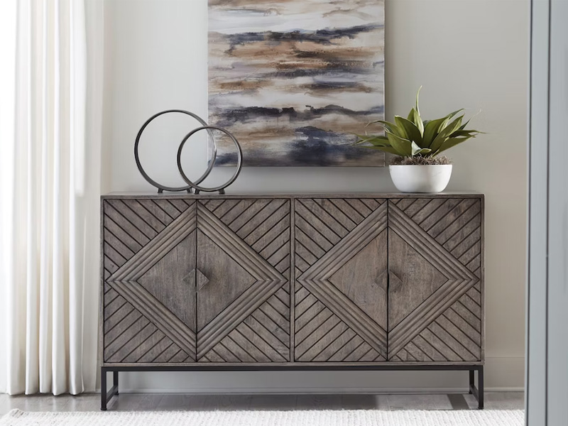 For admirers of understated vintage glamour, this accent cabinet beautifully complements your desired aesthetic. The classic charm of a distressed gray finish meets chic metropolitan styling, with art deco-inspired door fronts and an industrial black metal base. A balanced blend of contemporary and casual design, this piece is the personification of laid-back luxury.