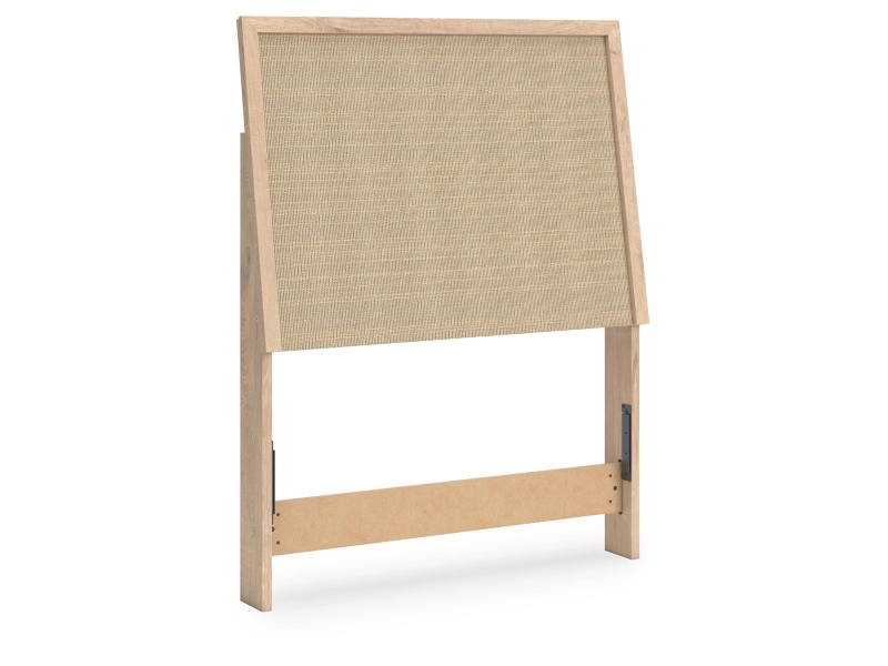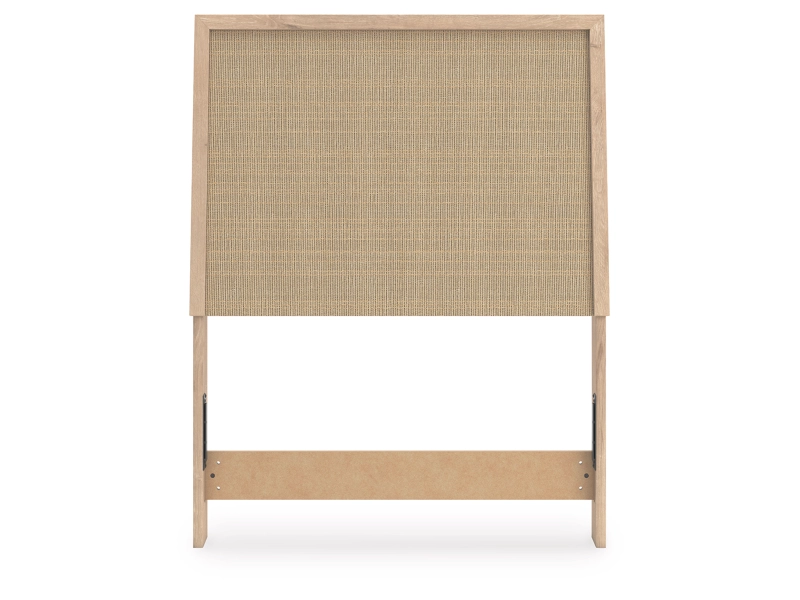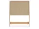 - Headboard panel with textured beige finish that replicates the look of cane