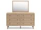 Clean-lined and contemporary—but far from stark—this dresser with mirror is a fresh style awakening. Pairing a light finish with replicated oak grain and textured beige details that replicate the look of cane, its mixed materials bring a naturally versatile vibe to your bedroom. Prepare to have your mind blown by the vast universe of possibilities that await within the spacious drawers. Whether you're prepping for work or getting ready to hit the town, the mirror will have you looking fabulous from every angle.