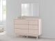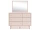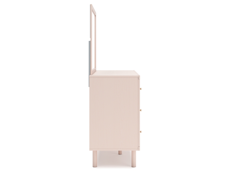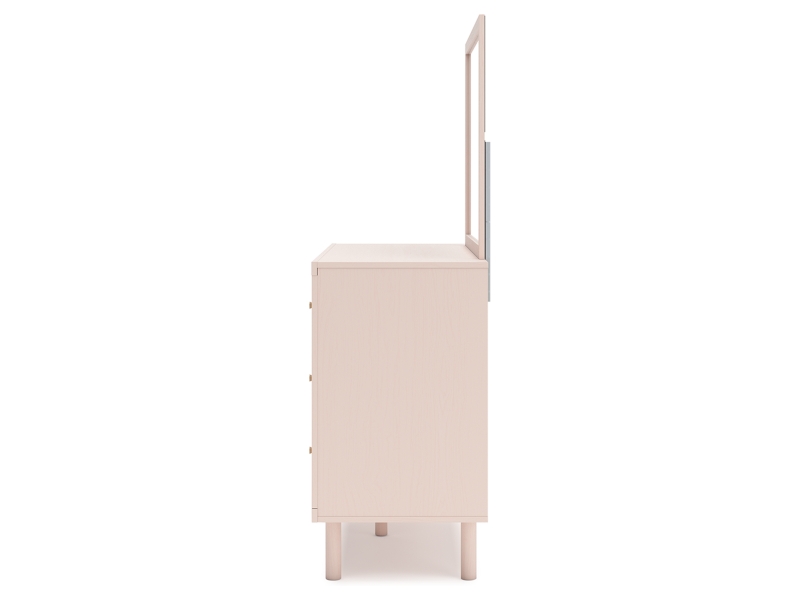 Subtle blush finish over replicated pecan wood grain. Inset drawers with champagne colored knobs. Side roller glides offer a smooth opening and closing of the drawer. Drawer interiors are lined with a replicated linen design for a clean, finished look. All cases feature cylindrical legs. Slim USB charger located on the back of the night stand tops. Twin (53) and full (87) upholstered headboards can attach to a bolt-on metal bed frame B100-21. Bed panels (52,84) require the use of twin/full platform rails (89) and roll slats (B100-11, B100-12). All side storage options (50,150) requires the use of the B100-11, B100-12 roll slats. All under bed storage units (50,150) accommodates to 10.5"W x 10.5"D x 11"H cube storage bins. Mirror (36) has the versatility to mount on the dresser or to the wall horizontally or vertically. Minor assembly required. Safety is a top priority, clothing storage units are designed to meet the most current standard for stability, ASTM F 2057 (ASTM International). Drawers extend out to accommodate maximum access to drawer interior while maintaining safety.