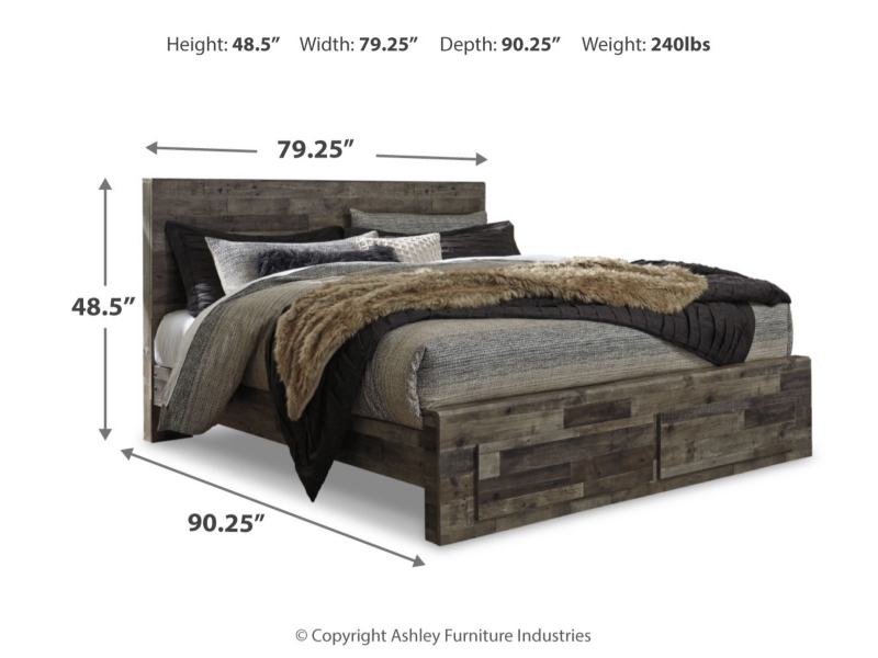 Modern yet hefty. This king panel storage bed makes an urban eclectic statement. Seasoned raw wood look merges with the clean lined design we love today. Muted rustic finish over replicated pine grain maintains its authenticity for a beauteous look. Storage in the footboard and underneath the bed provides ample space for placing belongings out of sight. Dresser, mirror, cheat and 2 nightstands included.