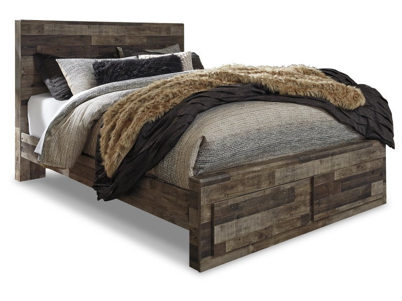When you want a bedroom that makes a bold statement, this queen bed with storage is for you. Rustic butcher block finish is tastefully roughhewn, with appealing color variations and imperfections. The substantial design is hearty and robust, perfect if you love the feel of modern farmhouse living. 2 matching chests and 2 nightstands included.