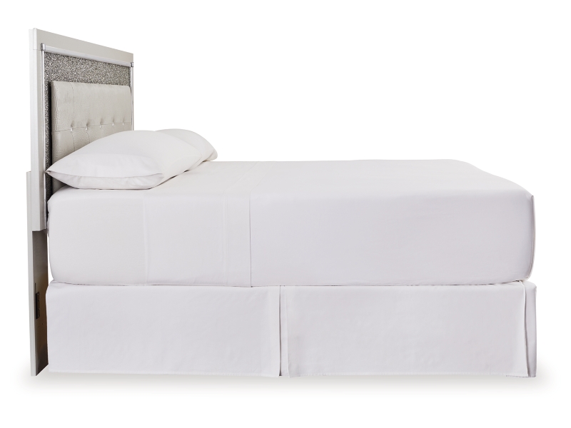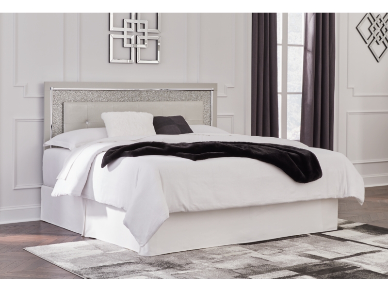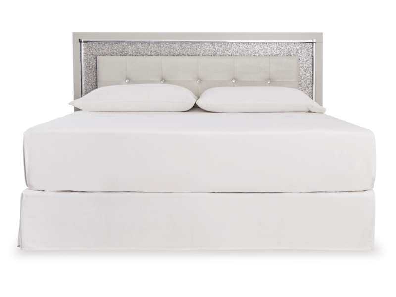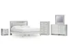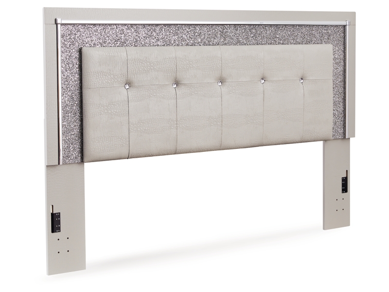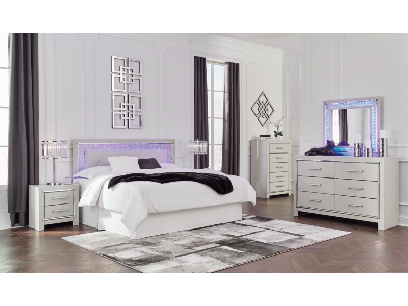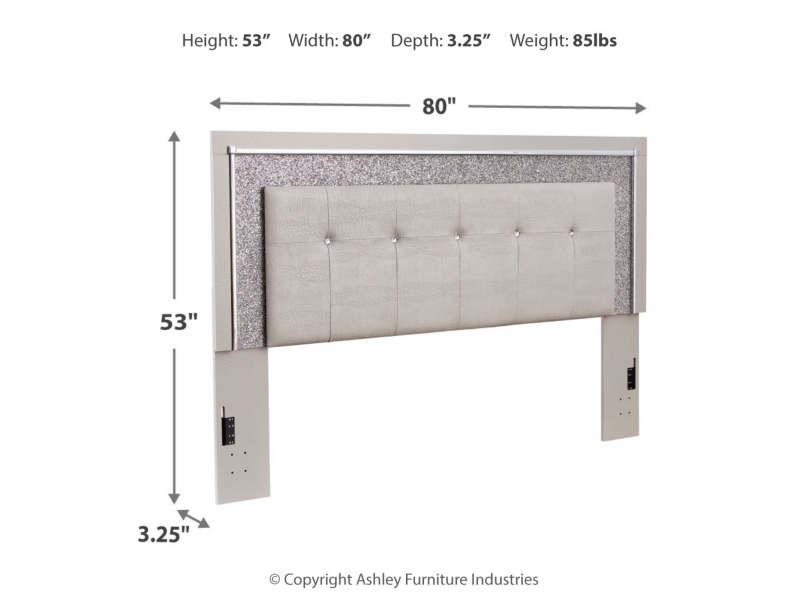 All over silver pearl finish faux gator. Cases and bed are accented with faceted chrome details. Dazzling faux crystal accented handles. Headboard features LED lighting and includes a remote for color and brightness options. Included remote holder discreetly keeps light remote accessible. Headboards are accented with faux crystal tufts on a faux gator silver upholstery and glitter inlays. Side roller glides for smooth operating drawers. Drawer interiors are lined with a faux linen laminate for a clean finished look. Both king (58), queen (57) and full (87) panel beds work with panel footboard (54,56,84) respectively. Full (87), queen (57) and king (58) headboards can attach to a bolt-on metal bed B100-21, B100-31 or B100-66 respectively. Queen (57) panel headboard is capable of attaching a full sized metal bolt on bed frame. Both USB and wireless charging options are provided with the nightstand. Mirror (36) has the versatility to be mounted on dresser or wall horizontally or vertically. Safety is a top priority, clothing storage units are designed to meet the most current standard for stability, ASTM F 2057 (ASTM International). Drawers extend out to accommodate maximum access to drawer interior while maintaining safety. Minor assembly required.