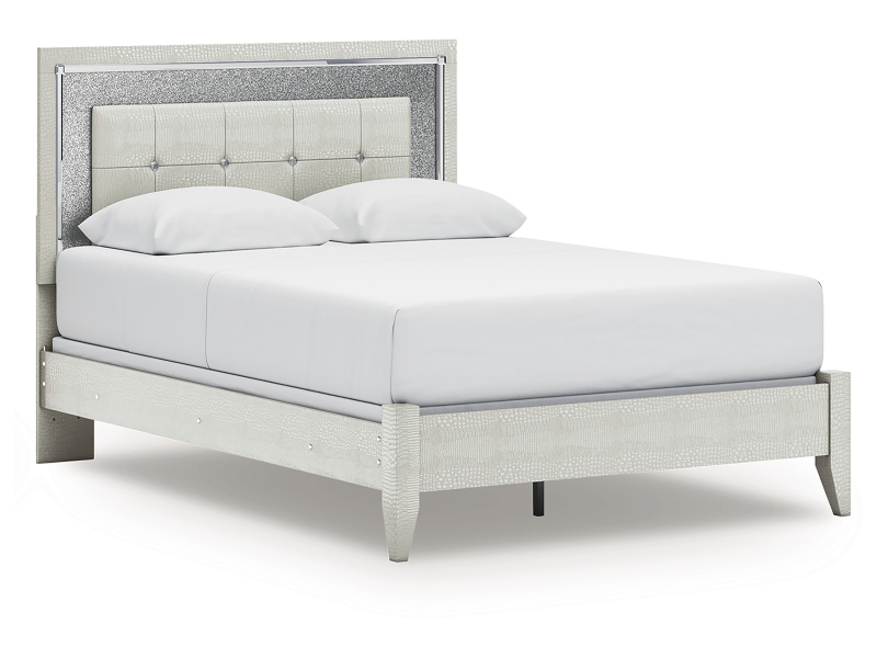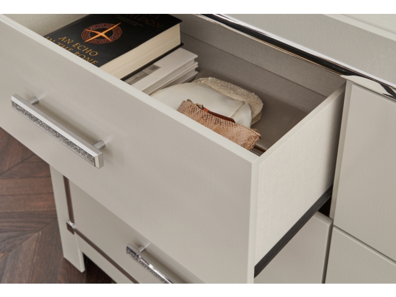 All over silver pearl finish faux gator. Cases and bed are accented with faceted chrome details. Dazzling faux crystal accented handles. Headboard features LED lighting and includes a remote for color and brightness options. Included remote holder discreetly keeps light remote accessible. Headboards are accented with faux crystal tufts on a faux gator silver upholstery and glitter inlays. Side roller glides for smooth operating drawers. Drawer interiors are lined with a faux linen laminate for a clean finished look. Both king (58), queen (57) and full (87) panel beds work with panel footboard (54,56,84) respectively. Full (87), queen (57) and king (58) headboards can attach to a bolt-on metal bed B100-21, B100-31 or B100-66 respectively. Queen (57) panel headboard is capable of attaching a full sized metal bolt on bed frame. Both USB and wireless charging options are provided with the nightstand. Mirror (36) has the versatility to be mounted on dresser or wall horizontally or vertically. Safety is a top priority, clothing storage units are designed to meet the most current standard for stability, ASTM F 2057 (ASTM International). Drawers extend out to accommodate maximum access to drawer interior while maintaining safety. Minor assembly required.