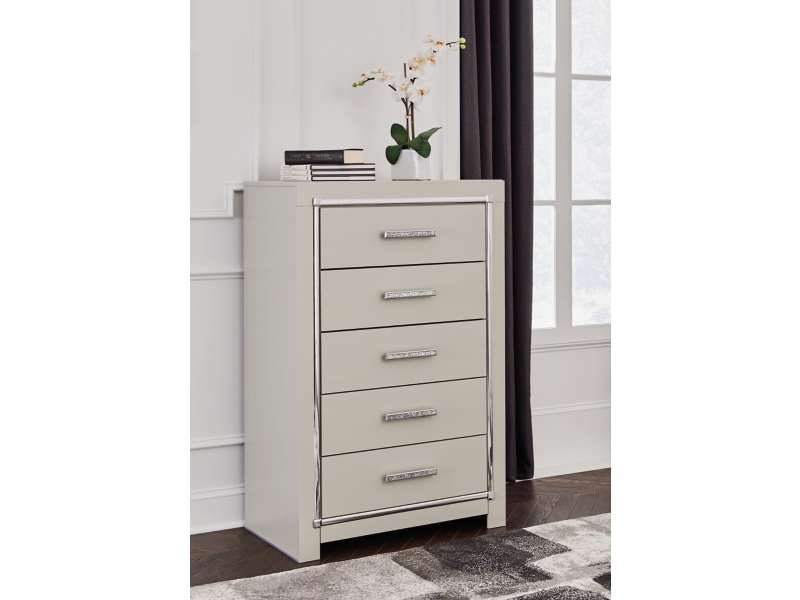 Bright, bold luxury. This queen upholstered bed dazzles with its attention to detail. Your love of glamorous style is reflected in the faux crystal tufted upholstery, exquisitely paired with faceted chrome-tone and glittery details. Complete with LED lighting around the headboard, it inspires you to live luxuriously every day—from waking up to reading before bed. Set also includes a dresser, mirror, chest and nightstand.