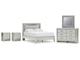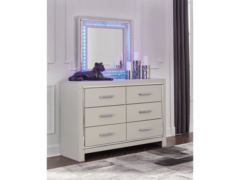 All over silver pearl finish faux gator. Cases and bed are accented with faceted chrome details. Dazzling faux crystal accented handles. Headboard features LED lighting and includes a remote for color and brightness options. Included remote holder discreetly keeps light remote accessible. Headboards are accented with faux crystal tufts on a faux gator silver upholstery and glitter inlays. Side roller glides for smooth operating drawers. Drawer interiors are lined with a faux linen laminate for a clean finished look. Both king (58), queen (57) and full (87) panel beds work with panel footboard (54,56,84) respectively. Full (87), queen (57) and king (58) headboards can attach to a bolt-on metal bed B100-21, B100-31 or B100-66 respectively. Queen (57) panel headboard is capable of attaching a full sized metal bolt on bed frame. Both USB and wireless charging options are provided with the nightstand. Mirror (36) has the versatility to be mounted on dresser or wall horizontally or vertically. Safety is a top priority, clothing storage units are designed to meet the most current standard for stability, ASTM F 2057 (ASTM International). Drawers extend out to accommodate maximum access to drawer interior while maintaining safety. Minor assembly required.
