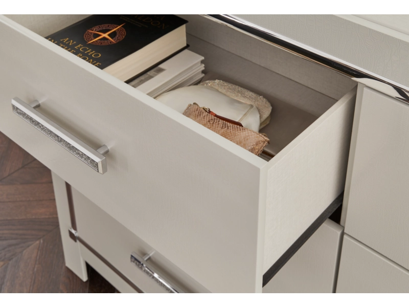 Bright, bold luxury. This bedroom package dazzles with its attention to detail. Your love of glamorous style is reflected in its all-over faux gator in a metallic finish, exquisitely paired with faceted chrome-tone details. With its opulent approach to bedroom style, this set inspires you to live luxuriously every day.