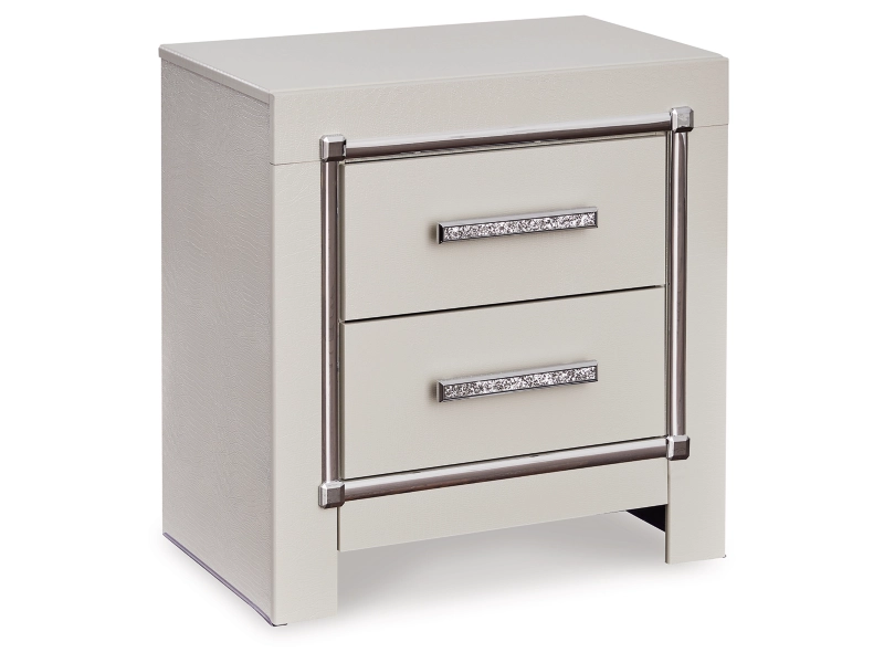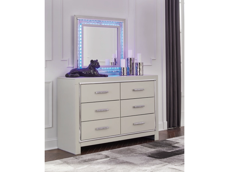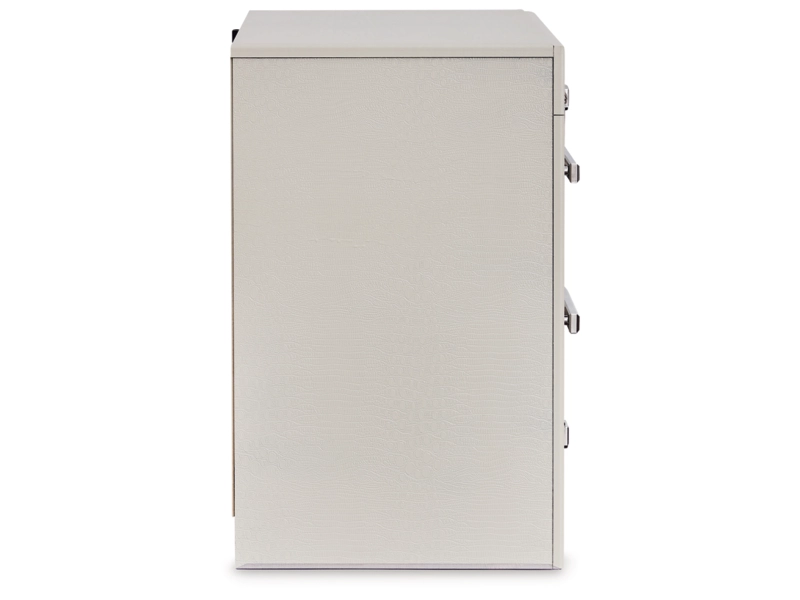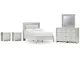 All over silver pearl finish faux gator. Cases and bed are accented with faceted chrome details. Dazzling faux crystal accented handles. Headboard features LED lighting and includes a remote for color and brightness options. Included remote holder discreetly keeps light remote accessible. Headboards are accented with faux crystal tufts on a faux gator silver upholstery and glitter inlays. Side roller glides for smooth operating drawers. Drawer interiors are lined with a faux linen laminate for a clean finished look. Both king (58), queen (57) and full (87) panel beds work with panel footboard (54,56,84) respectively. Full (87), queen (57) and king (58) headboards can attach to a bolt-on metal bed B100-21, B100-31 or B100-66 respectively. Queen (57) panel headboard is capable of attaching a full sized metal bolt on bed frame. Both USB and wireless charging options are provided with the nightstand. Mirror (36) has the versatility to be mounted on dresser or wall horizontally or vertically. Safety is a top priority, clothing storage units are designed to meet the most current standard for stability, ASTM F 2057 (ASTM International). Drawers extend out to accommodate maximum access to drawer interior while maintaining safety. Minor assembly required.