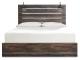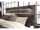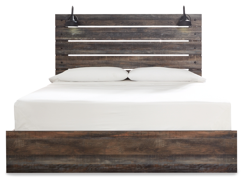 Burnt orange and teal colors accent a brown rustic finish in a replicated woodgrain with authentic touch. Large scaled dark colored handles. Cases feature a framed front and pilasters. All panel headboards (53,57,58,87) feature decorative matte black sconce lights. Side roller glides for smooth operating drawers. All panel headboards (53,57,58,87) can attach to a bolt-on metal bed frame B100-31 or B100-66 respectively. Drawers lined with a faux linen laminate for a clean, finished look. Slim profile dual USB chargers located on the back of the night stand top and the side of the headboards. All side storage options (50,150,60,160) requires the use of the B100-11, B100-12, B100-13 or the B100-14 roll slats. All under bed storage units (50,150,60,160) accommodates to 10.5"W x 10.5"D x 11"H cube storage bins. LED lights accent bookcase headboards (65,69,85). All beds have a panel footboard (52,84,54,56) and storage footboard option (84S,54S,56S). Queen (65) and king (69) headboards can attach to a bolt-on metal bed frame B100-31 or B100-66 respectively. Queen (65) bookcase headboard is capable of attaching a full sized metal bolt on bed frame. Full (85) headboard can attach to a bolt-on metal bed frame B100-21. Safety is a top priority, clothing storage units are designed to meet the most current standard for stability, ASTM F 2057 (ASTM International). Drawers extend out to accommodate maximum access to drawer interior while maintaining safety.