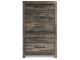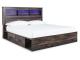 When merged in just the right way, rustic and industrial styles can make one happy marriage. Case in point: this king bookcase bed with storage. A refined take on barn board beauty, its complex, replicated wood grain showcases hints of burnt orange and teal tones for a sense of weatherworn authenticity. Three open cubbies lined with a dimming LED light strip keep bedtime reads top of mind. Underneath the bed: a pair of smooth-gliding drawers and two open cubbies that accommodate casually cool storage bins. Dresser, mirror, chest and 2 nightstands also included.