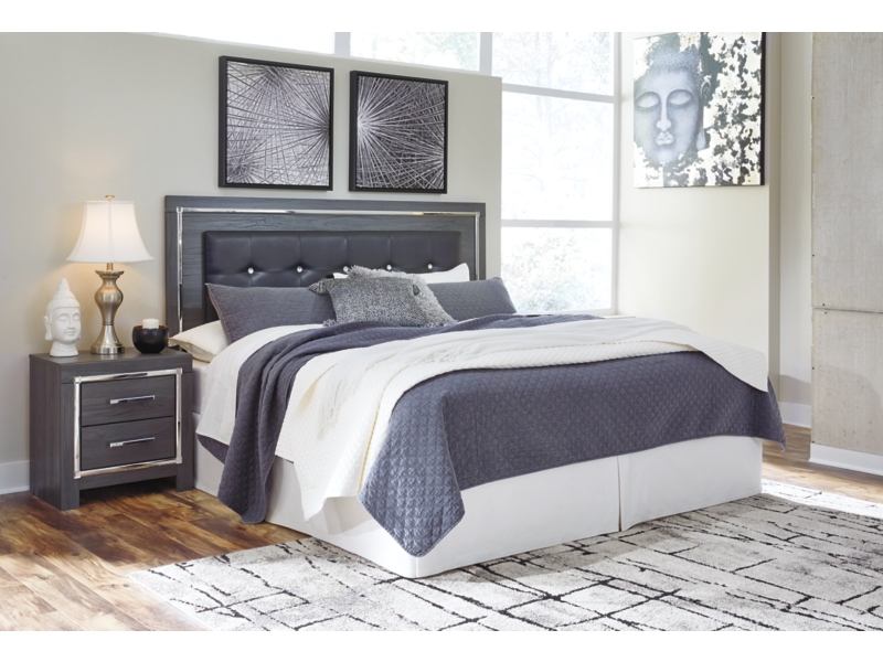 Modern gray finish with replicated wood grain. Cases and bed are accented with faceted chrome details. Large scaled chrome handle with faceted details. Headboards are accented with LED lighting and include a remote for color and brightness options. Included remote holder discretely keeps light remote accessible. Headboards are accented with faux crystal tufted black upholstery. Side roller glides for smooth operating drawers. Drawer interiors are lined with a faux linen laminate for a clean finished look. Both king, queen and full panel beds have a panel footboard (84,54,56) and storage footboard option (84S,54S,56S). Full (87), Queen (57) and King (58) headboards can attach to a bolt-on metal bed B100-21, B100-31 or B100-66 respectively. Queen (57) upholstered panel headboard is capable of attaching a full sized metal bolt on bed frame. Both USB and wireless charging options are provided with the night stand. Queen (54,54S) and king (56,56S) can use -95 platform rails and require B100-13 (queen) or B100-14 (king) roll slats eliminating the need for a box spring. Safety is a top priority, clothing storage units are designed to meet the most current standard for stability, ASTM F 2057 (ASTM International). Drawers extend out to accommodate maximum access to drawer interior while maintaining safety.