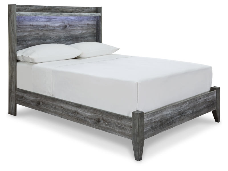 Rest in the casually cool style of this full panel bed. Its driftwood and smoky finish and cool LED lighting give this bed an easy-going vibe perfect for setting the scene of a relaxed getaway. Clean lines and modern handles provide a fuss-free look. Mattress and foundation/box spring available, sold separately.